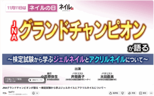 2025/11/11公開予定 JNAグランドチャンピオンが語る ~検定試験から学ぶジェルネイルとアクリルネイルについて~ 2025年11月3日 コメントを書く 2025/11/11 に公開予定 出演: 小笠原弥生(JNA理事、教育委員会委員長) 井筒貴子(JNA常任本部認定講師/MEリーダー) 太田直美(JNA常任本部認定講師/ME) ▼ネイルTV▼ https://nail- […] 続きを読む »